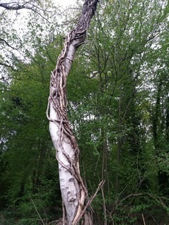 Tijdens een meditatieve wandeling viel mijn blik op deze wurgende samenwerking tussen een klimop en een berk.